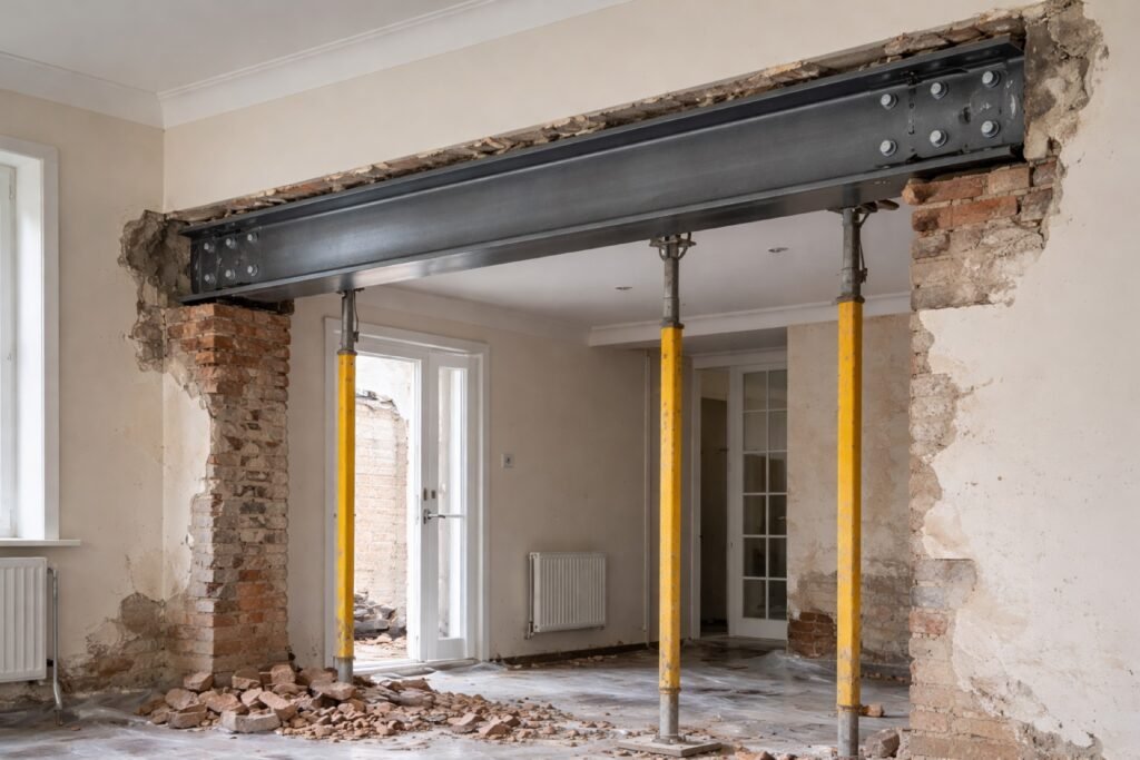 En tant qu’artisan maçonnerie rénovation, nous réalisons l’ensemble des travaux liés à l’ouverture de murs porteurs et à la pose de poutres acier (linteau métallique / IPN) pour redistribuer les charges. Notre intervention comprend le calepinage, la mise en place d’un étaiement vertical provisoire avec étais et tirants, la découpe soignée du mur en briques ou en maçonnerie traditionnelle, la repose ou la fixation de la poutre métallique, puis la dépose progressive des étais après contrôle. Nous adaptons la section de la poutre à la portée et aux charges, travaillons en coordination avec d’autres corps d’état si besoin (électricien, plaquiste), et réalisons les reprises d’enduit et de maçonnerie autour du linteau pour une finition propre. Nous intervenons sur des bâtis anciens comme modernes et prenons en compte les contraintes thermiques et acoustiques pour assurer un résultat durable.